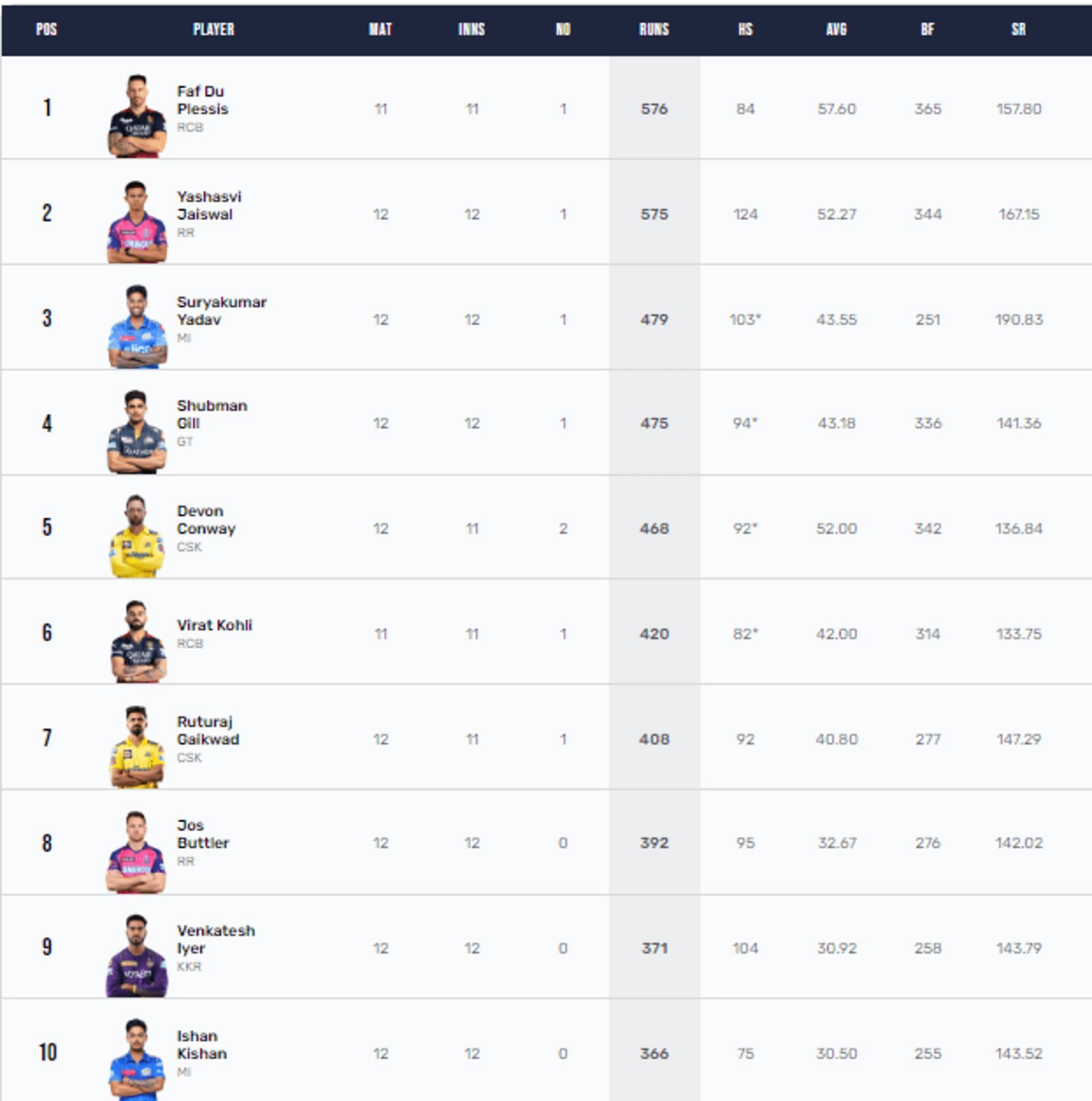 Faf du Plessis is the current holder of the IPL 2023 Orange Cap with 576 runs in 11 innings at a strike rate of 157.80.
