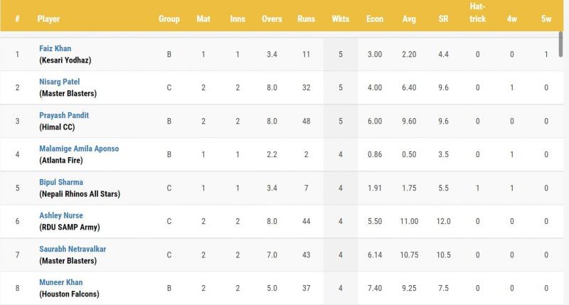 Malamige Amila Aponso finished with figures of 4/2, while Bipul Sharma returned with figures of 4/7 from their respective games. They are stationed in fourth and fifth positions in the most wicket-takers' chart.