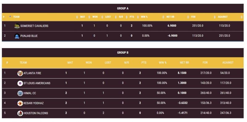 Speaking of Group B, the Atlanta Fire are first in the points table with a win from the only game they have played thus far. St Louis Americans, on the other hand, also have two points and are placed second in the points table due to their run rate.