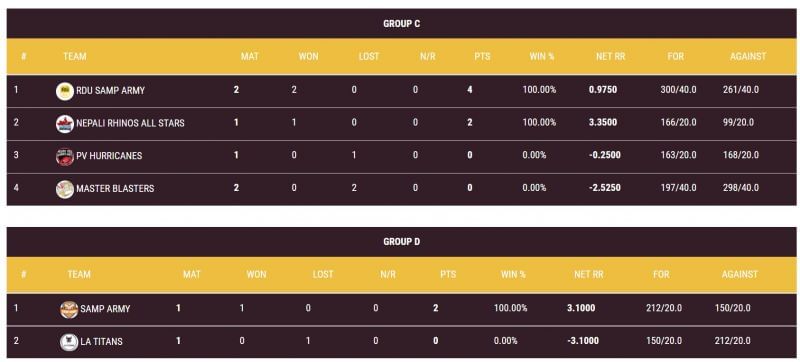 RDU Samp Army top the Group C charts with a couple of victories to their name. They defeated the Master Blasters and PV Hurricanes on Thursday, who are placed in third and fourth position, respectively.