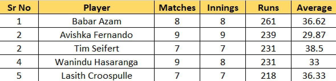Babar Azam of Colombo Strikers is the current leading run-scorer in the Lanka Premier League, despite not having a chance to add to his tally after his side failed to qualify for the playoffs. The right-handed batter scored 261 runs in eight games and sits comfortably at the top of the most runs list.