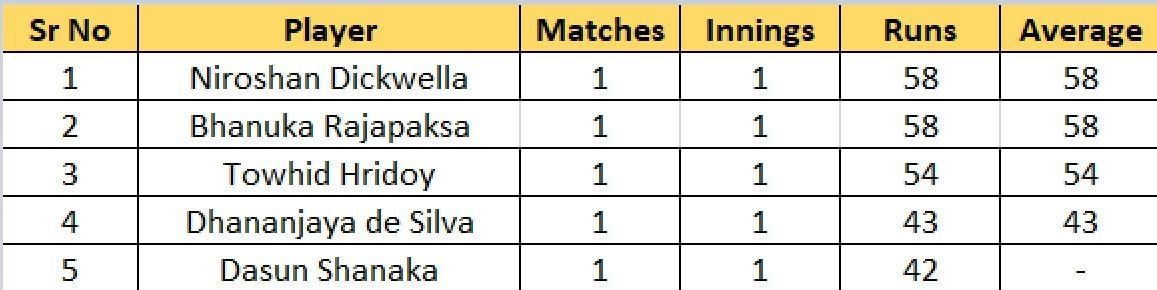 Bhanuka Rajapaksa of Galle Titans has jumped to the second spot in the most runs list after the conclusion of match two. He played a well-composed knock of 48 off 34 balls against Dambulla Aura. Chasing 10 in the super over, Rajapaksa hit 10* off two balls to take his side home. He now has 58 runs to his name and sits below Dickwella.