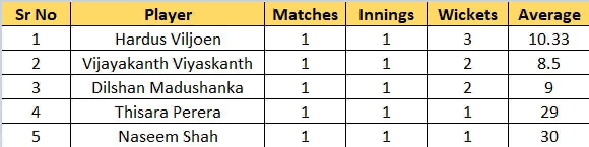 Dilshan Madushanka of the Kings is third in the wickets list. The left-arm pacer picked up two wickets, giving away 18 runs in his 2.4 overs and playing a key role in knocking over the Strikers for 152 to help his side get off to a winning start.