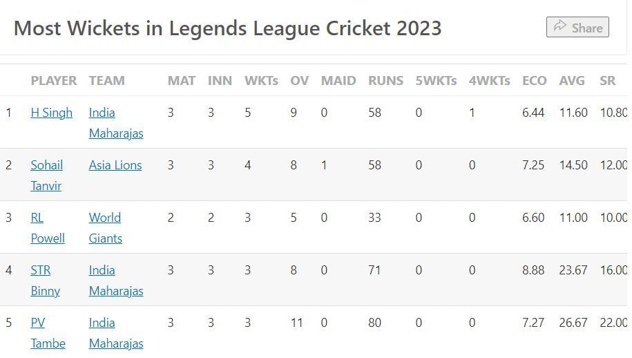 Legends League Cricket 2023 Most Wickets List