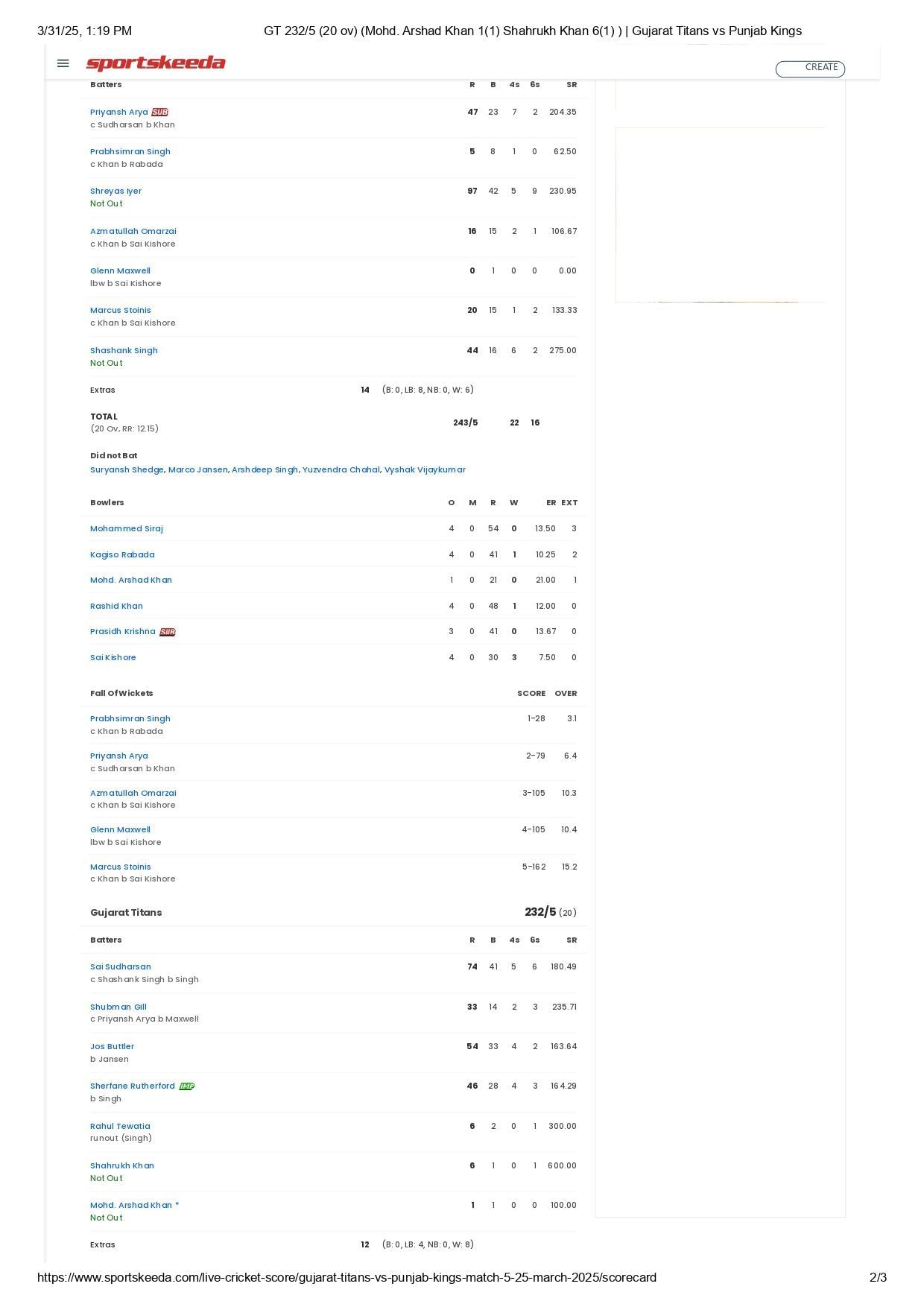 Later, Shashank Singh provided the finishing touches with 44* off 16 deliveries, hitting two maximums and six boundaries. Sai Kishore emerged as the leading wicket-taker for GT, finishing with figures of 3/30. Rashid Khan and Rabada picked up one wicket each.