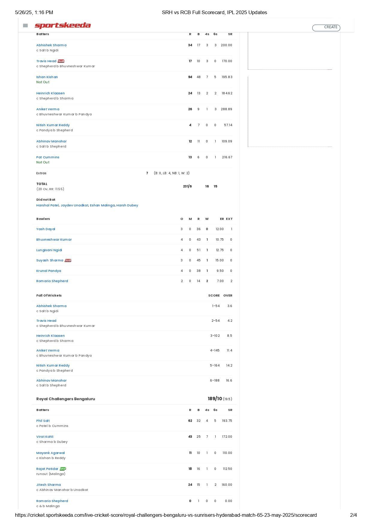 Romario Shepherd emerged as the leading wicket-taker for RCB, returning with figures of 2/14 in his two overs, while Bhuvneshwar Kumar, Lungi Ngidi, Suyash Sharma, and Krunal Pandya bagged one wicket apiece.