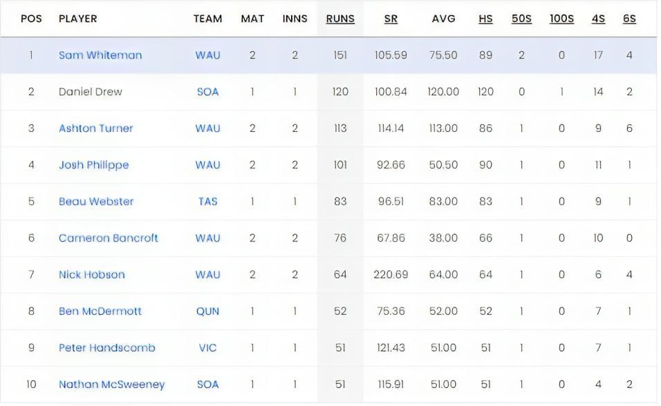 Sam Whiteman has displayed exceptional form this season, achieving a half-century in both of his outings. He currently stands as the leading run-scorer, having amassed 151 runs at an impressive average of 75.50 and a strike rate of 105.59. In this match, he contributed significantly with 89 runs off 91 deliveries, emerging as Western Australia's highest-scorer.