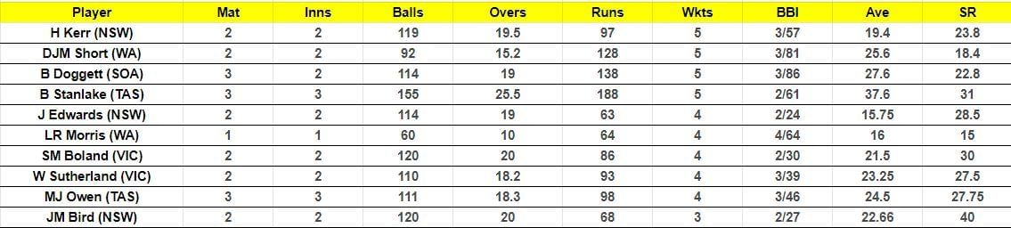 Second-placed D’Arcy Short has taken five wickets as well at an average of 25.60, an economy of 8.34, and a strike rate of 18.40.