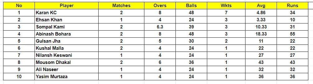 Kushal Malla made 92 runs off 41 deliveries in this game and has moved to the first place on this list. He has made 104 runs in three games at an average of 34.66 and a strike rate of 185.71.