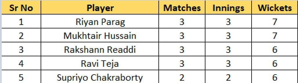 Mukhtar Hussain of Assam picked up a wicket in the semifinal but was expensive as he conceded 35 runs in his two overs. He now has taken his wickets tally to seven in the league and sits below his captain in the most wickets list.