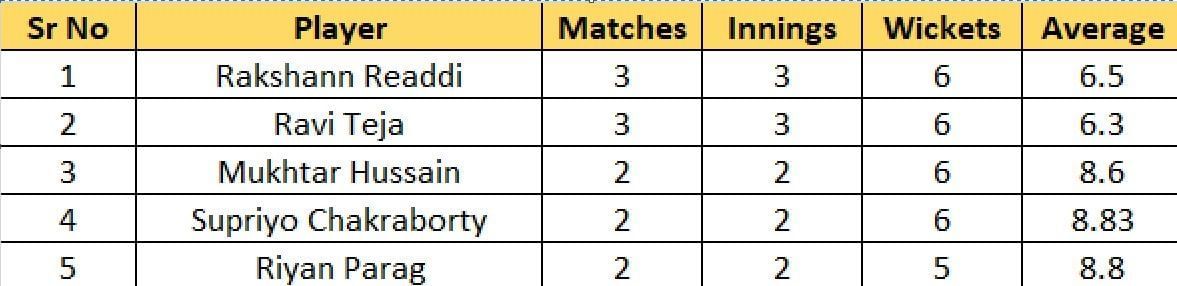 Mukhtar Hussain of Assam follows Teja in the list of most wickets of the Odisha T20 League 2023. Hussain has grabbed six wickets in two outings so far and is placed third in the most wickets list. He will play a key role for the Assam side in the semi-finals.