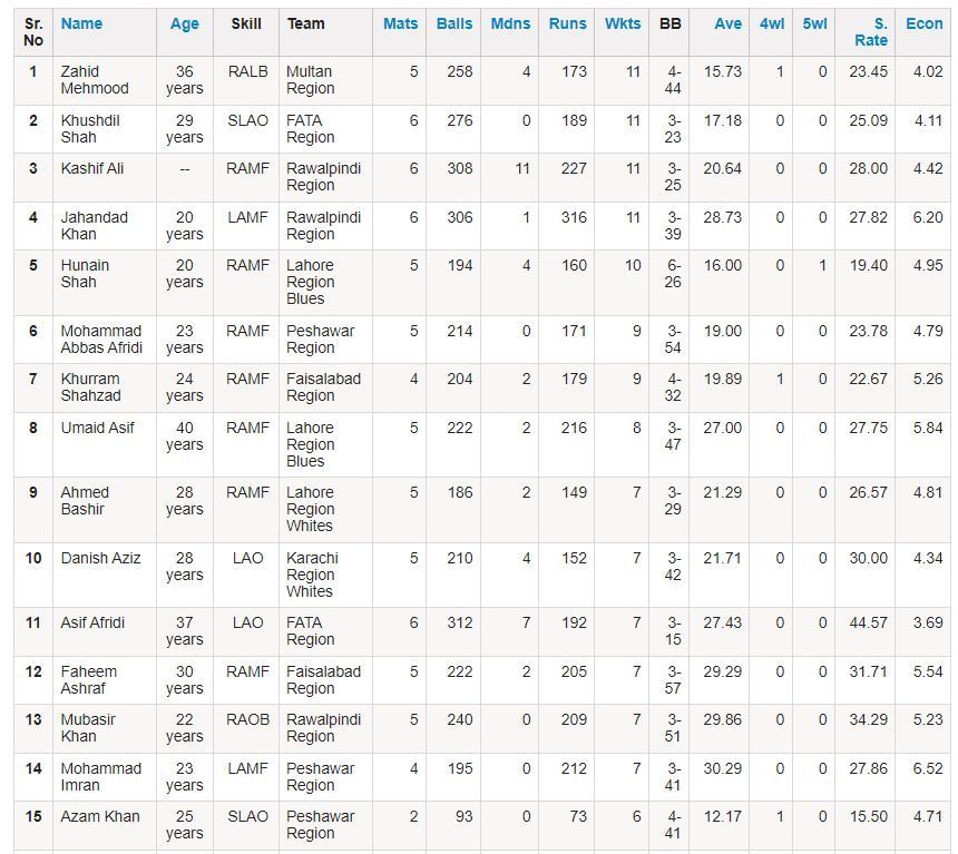 Multan leg-spinner Zahid Mehmood maintained his top position in the wickets tally with 11 wickets from five innings. FATA part-time spinner Khushdil Shah scalped two wickets against Faisalabad to move up by a couple of places and occupy the second position with 11 wickets.