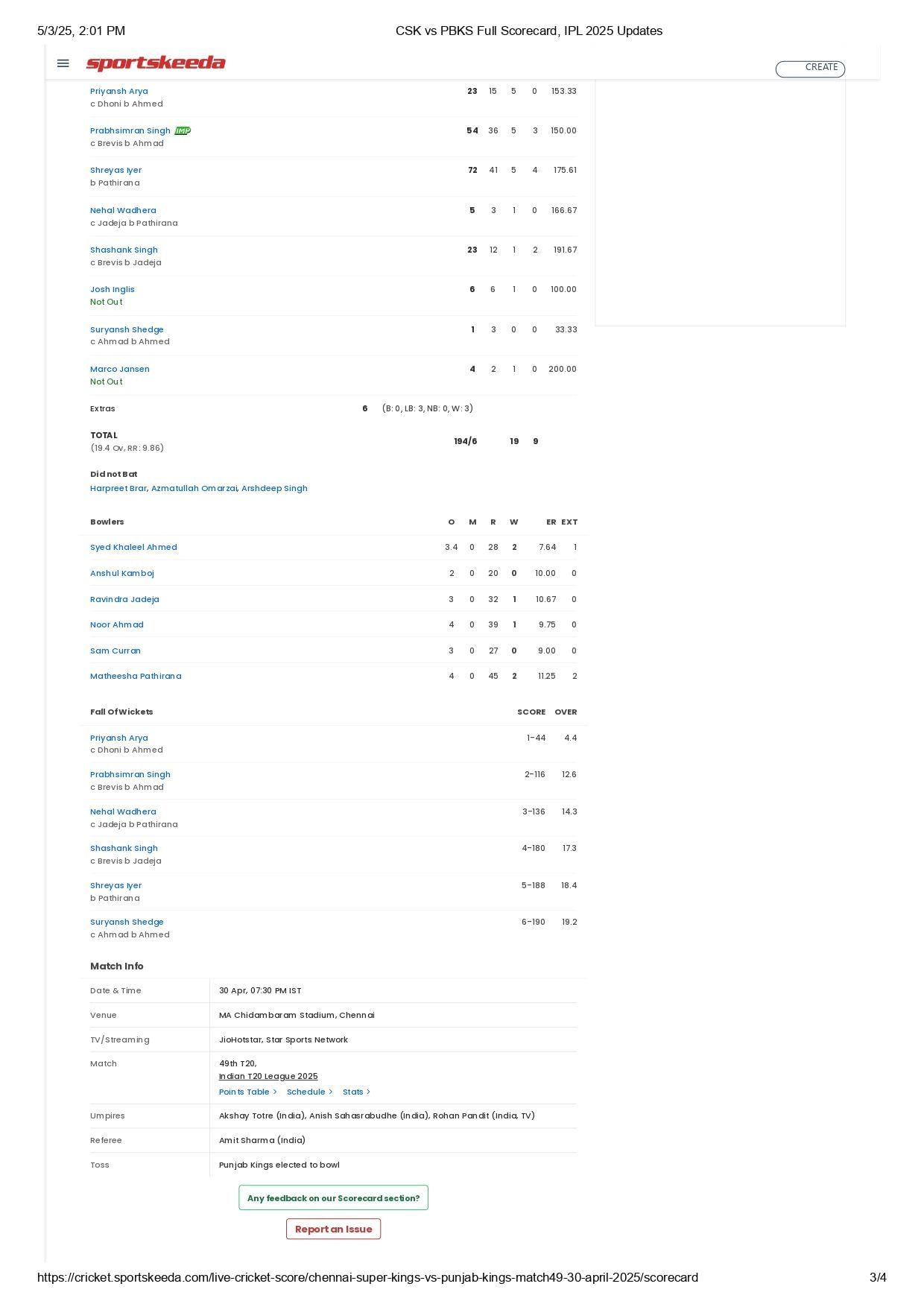 PBKS beat Chennai Super Kings (CSK) by four wickets in their last IPL 2025 match at Chepauk on April 20.