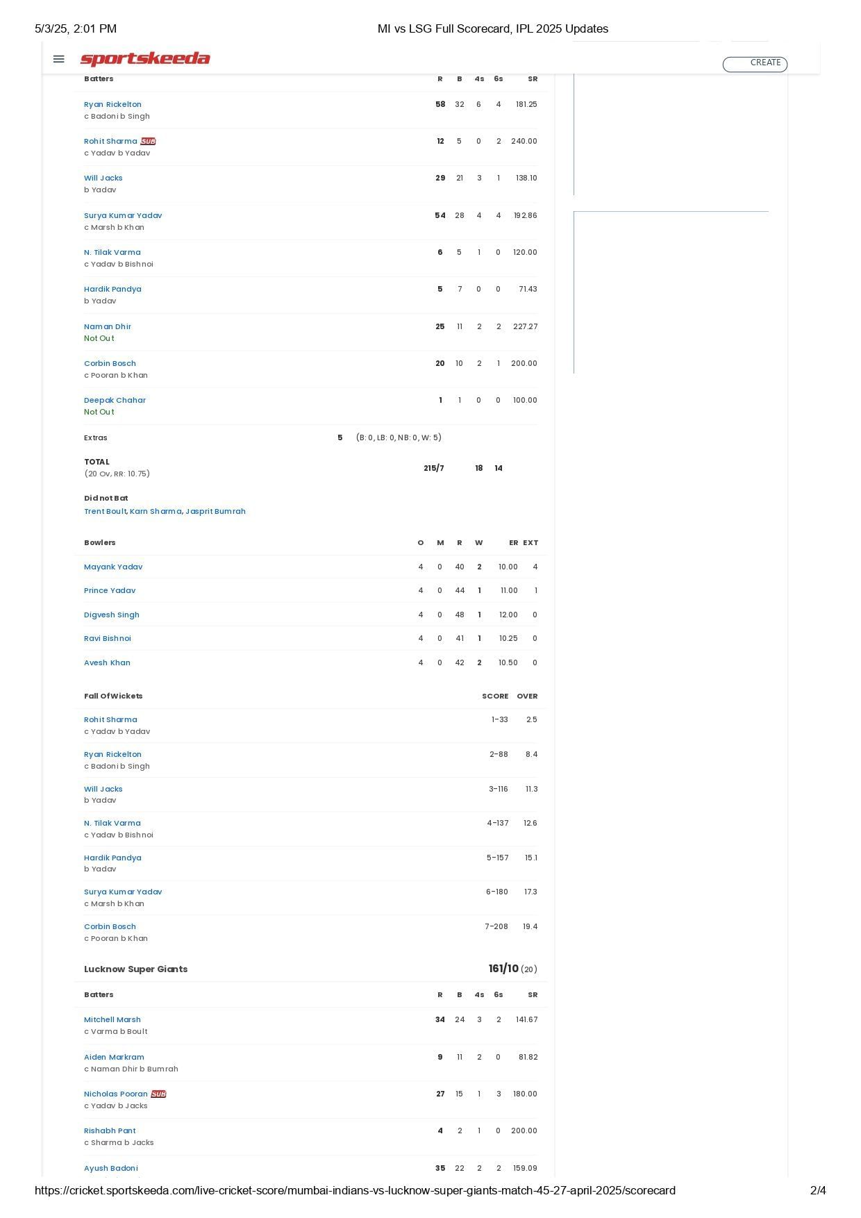 Asked to bat first, Mumbai posted 215/7. Ryan Rickelton and Suryakumar Yadav smashed half-centuries, scoring 58 (32) and 54 (28), respectively. Meanwhile, Will Jacks, Naman Dhir and Corbin Bosch chipped in with their 20s.
