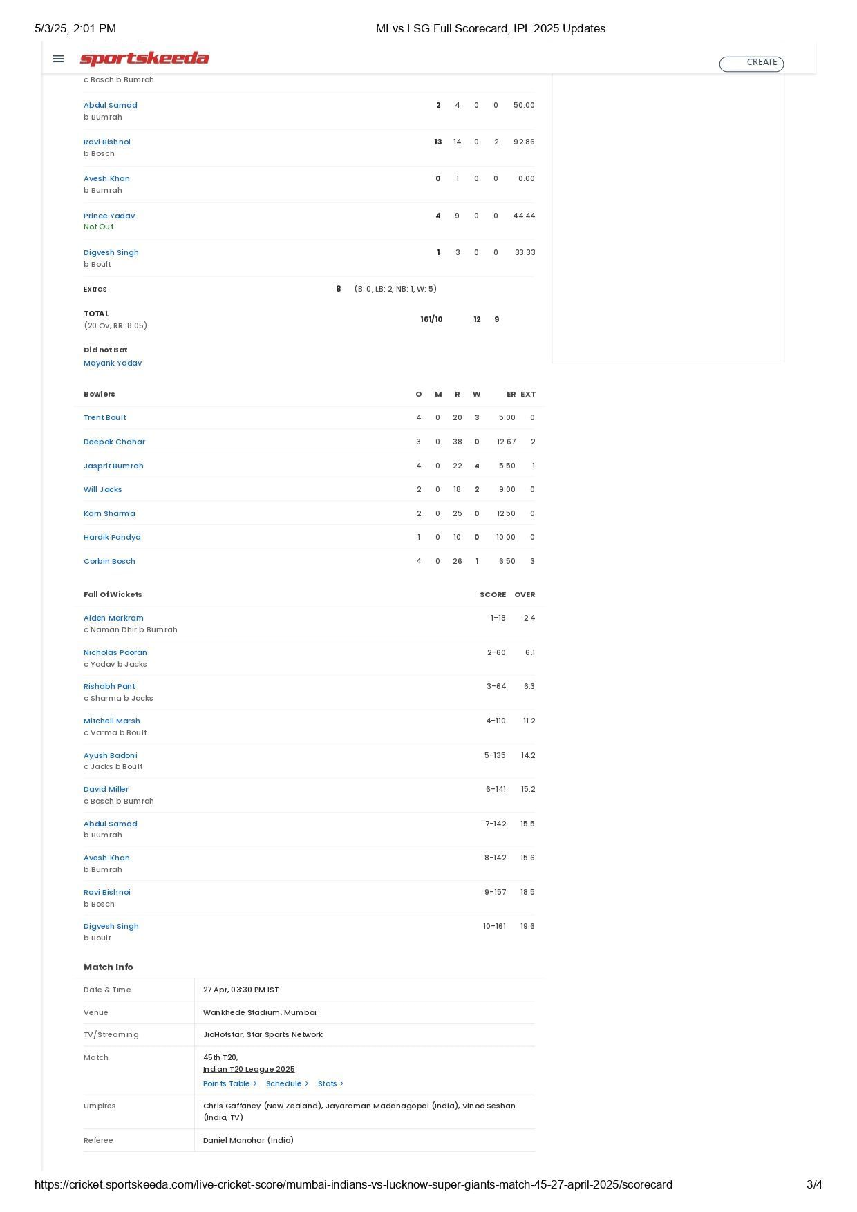 LSG lost to Mumbai Indians (MI) by 54 runs in their last IPL 2025 match at Wankhede on April 27.
