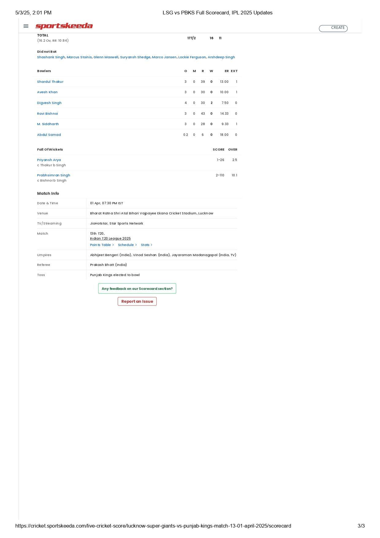 Avesh Khan and Mayank Yadav bagged two wickets each for Lucknow, while Prince Yadav, Digvesh Rathi and Ravi Bishnoi shared one wicket apiece.