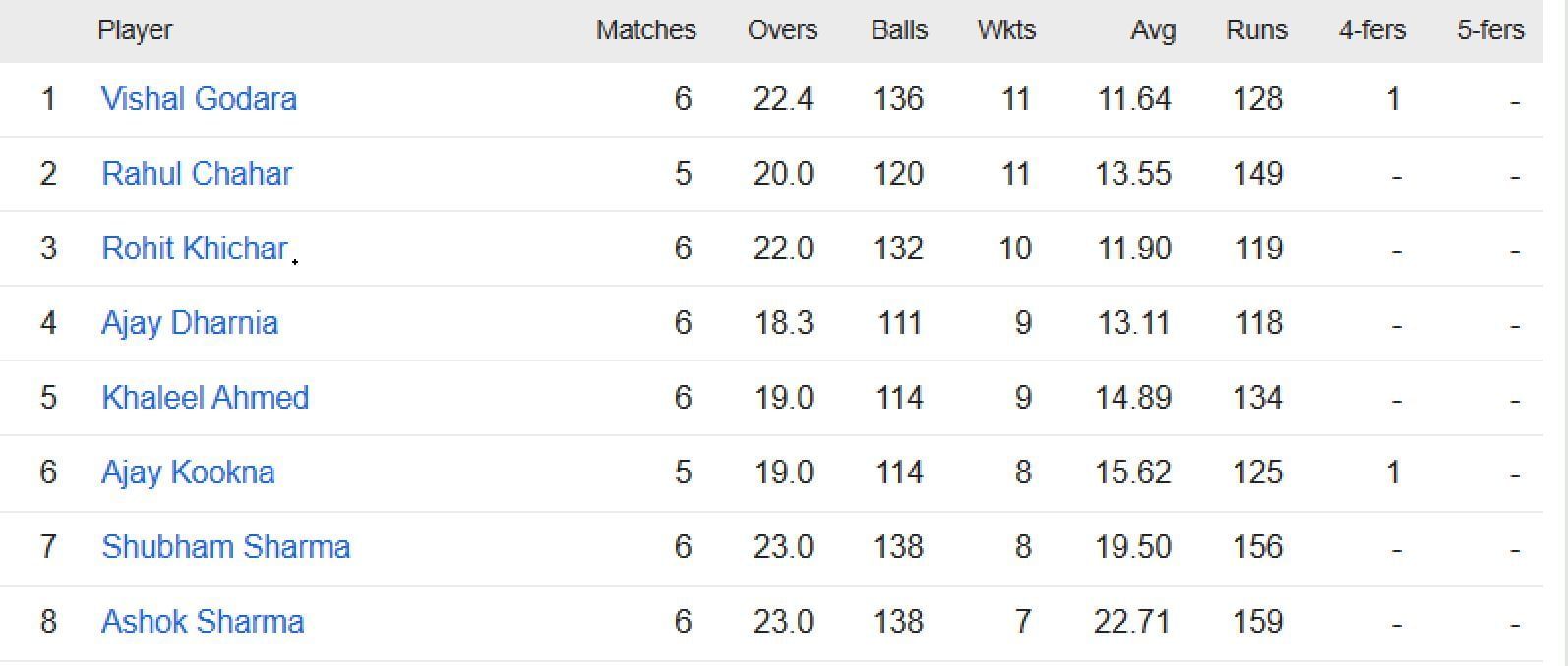 Rohit Khichar, who was on top of the list after the Eliminator, has dropped to third. He has taken 10 wickets from six matches at an average of 11.90. Ajay Dhamia, Khaleel Ahmed and Ajay Kookna have also been impressive with the ball this season.