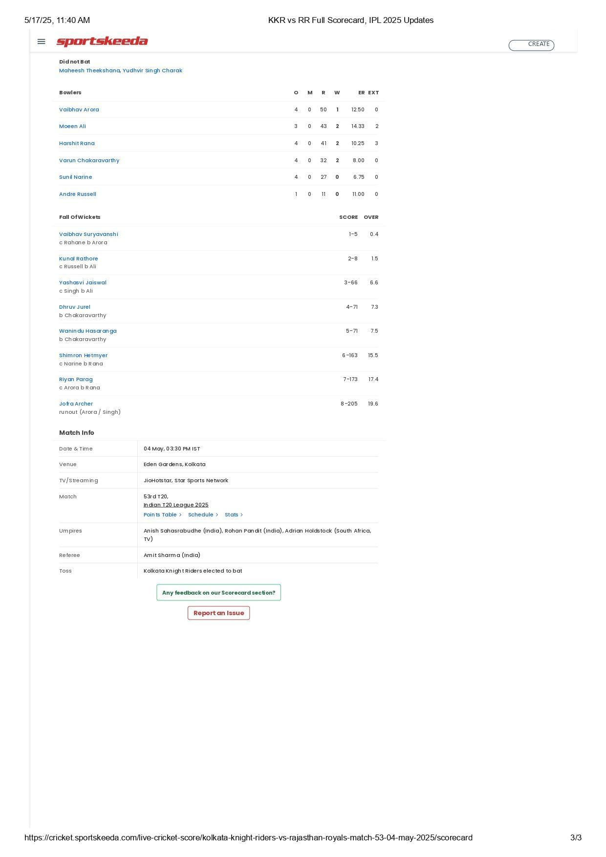 RR's scorecard from their last IPL 2025 match