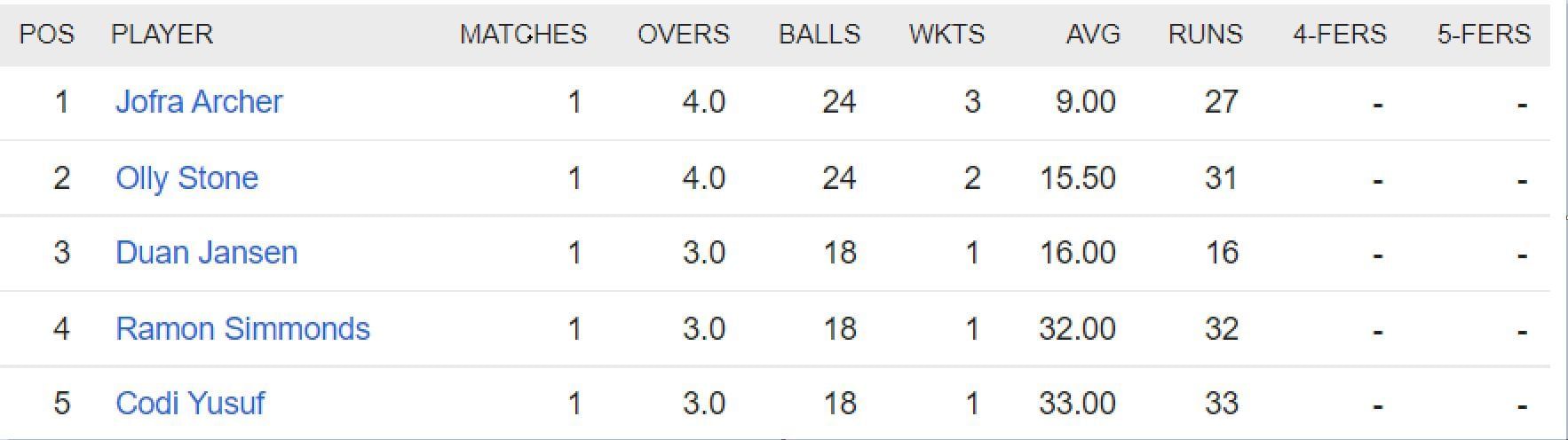 Jofra Archer, who hasn’t played a whole lot of competitive cricket over the last 24 months, is currently the top wicket-taker of the tournament. He also bowled a maiden, showing how tough it was for the batters to get him away. Olly Stone is second on the list with two scalps to his name. Duan Jansen, Ramon Simmonds and Codi Yusuf got one scalp apiece.