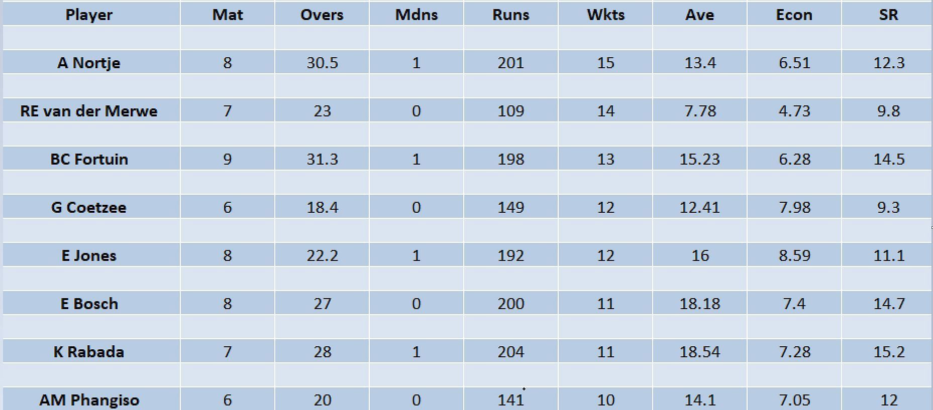 Anrich Nortje of the Pretoria Capitals has replaced Sunrisers Eastern Cape’s Roelof van der Merwe as the leading wicket-taker of the championship. Nortje has picked up 15 wickets from eight matches at an economy rate of 6.49.