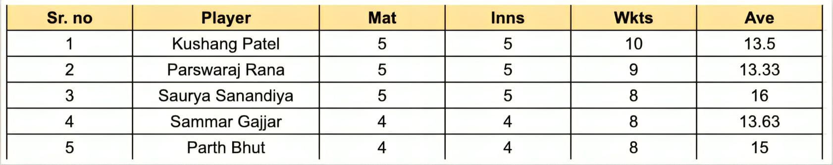 Kutch Warriors pacer Kushang Patel ended the tournament at the top with 10 wickets. His teammate, left-arm wrist spinner Parswaraj Rana, bagged the second spot with nine scalps from five innings.