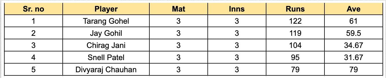 With an unbeaten knock of 101 runs, Tarang Gohel ascended to the leading position in the batting chart with 122 runs from three innings at an average of 61. Halar Hero's prolific batter Jay Gohil occupies the second position with 119 runs from three innings.