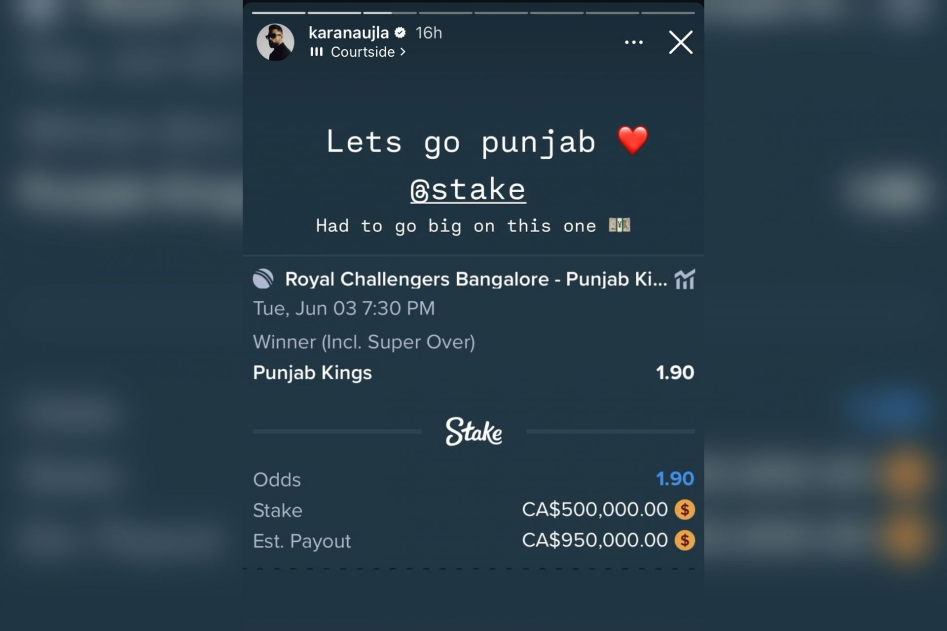 Ahead of the much-awaited match, Bollywood singer Karan Aujla shared on his Instagram story that he has placed a bet of CA$500,000 on Punjab Kings, which amounts to ₹3,11,15,000 (three crore eleven lakh fifteen thousand rupees). He captioned his story: