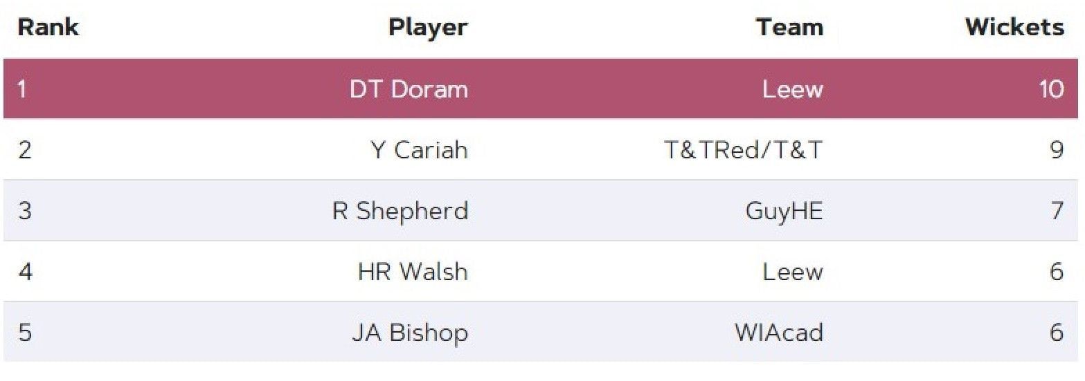 Yannic Cariah of Trinidad and Tobago Red Force sits just below Doram on the most wickets list. The wrist spinner has grabbed nine wickets in two innings at an impressive average of 10.11.
