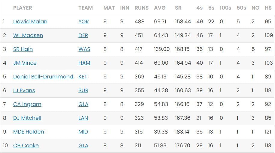 Next on the list is Derbyshire's Wayne Madsen with 451 runs, averaging 64.42, in nine games. While Birmingham Bears' Sam Hain occupies the third spot having 417 runs from eight games.