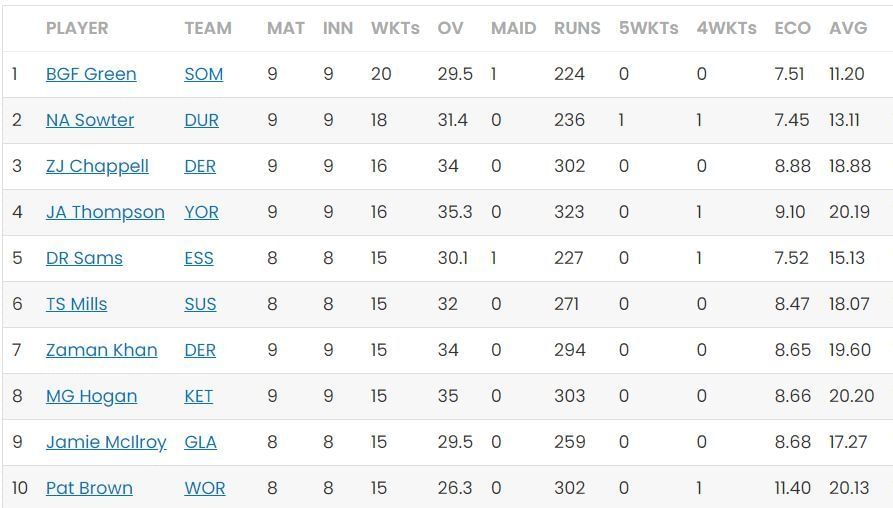 Next on the list is Nathan Sowter from Durham having 18 wickets from nine matches. While Zak Chappell of Derbyshire finds him in third place with 16 scalps.