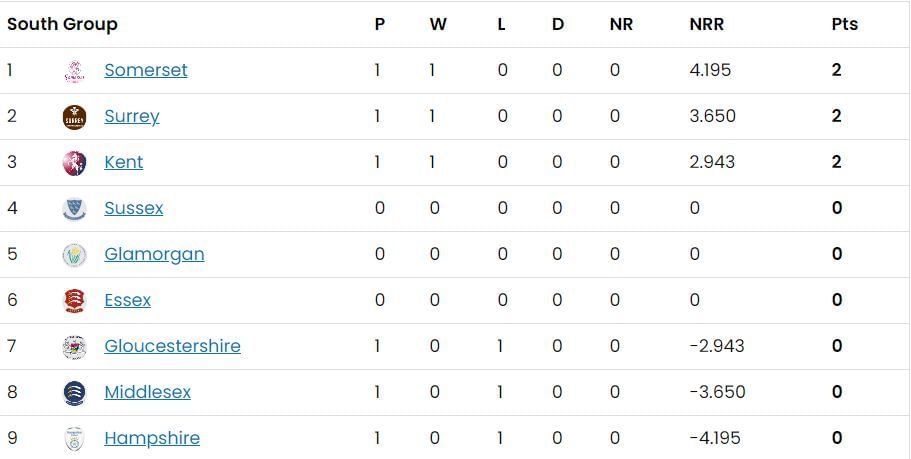 Meanwhile, in the South Group, Surrey has climbed to the second position after securing a victory in their opening match against Middlesex. Surrey now has two points and a commendable net run rate of 3.650. On the contrary, Middlesex currently finds themselves in the fifth position with a negative run rate of -3.650.