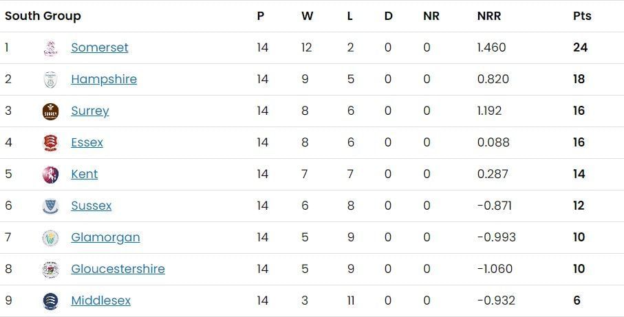 Derbyshire remain sixth with six wins and an NRR of 0.397. Essex have risen a place to fourth in the South group with eight wins and an NRR of 0.088, swapping places with Kent.