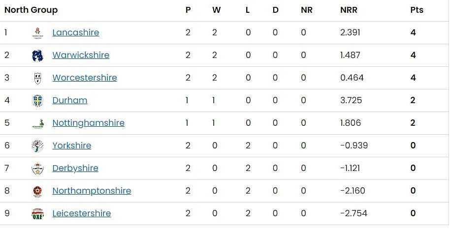 Nottinghamshire, however, dropped a position to fourth place as Durham secured a convincing victory. The remaining teams in the group have yet to secure a win, and their positions are determined by their Net Run Rates and absence of points.