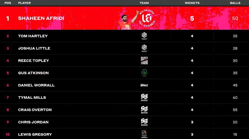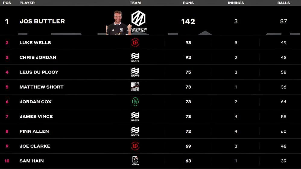 Despite many outstanding performances on the ninth day, Originals’ Buttler retained his first position in the batting charts. Although he managed 23 against the Invincibles, he sits atop the batting charts with 165 runs in four games.