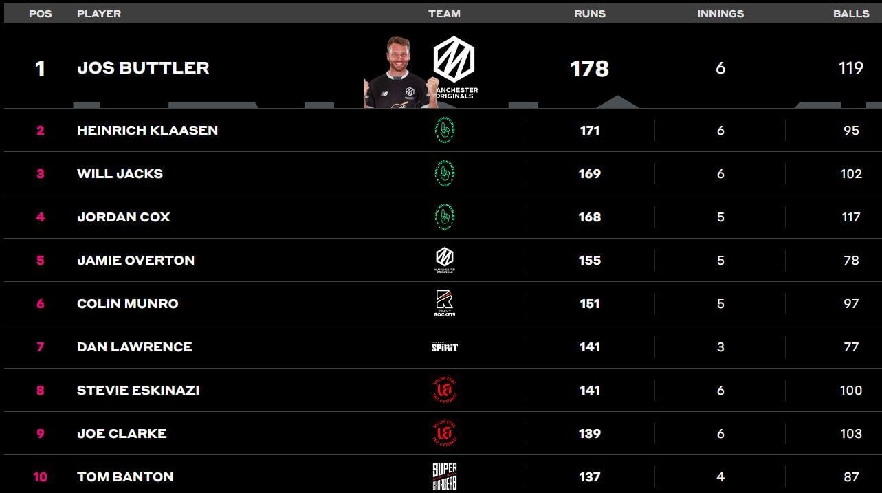 Oval Invincibles’ Heinrich Klaasen and Will Jacks are placed in the second and third places, respectively, with 171 and 169 runs to their names.