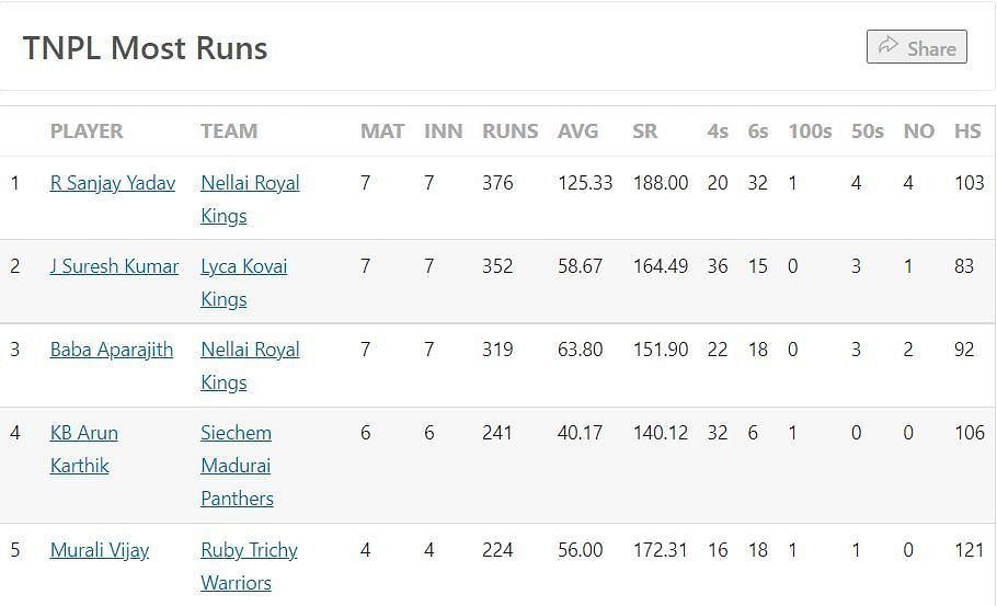 Nellai Royal Kings’ Baba Aparajith scored 37 in their last league game. He now has 319 runs to his name in seven matches. He averages 63.80 with the bat in the competition and is playing a vital role for the Royal Kings. He will continue to keep contributing for his side in the knockout stages of the competition.