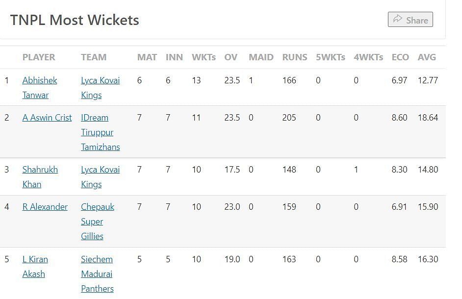 A Aswin Crist of IDream Tiruppur Tamizhans has 11 wickets to his name in seven games. He lead the bowling attack for the Tamizhans. He bowled beautifully but his side failed to qualify for the knockout stages of the competition. He also bowled with an economy rate of 8.60 throughout the tournament.