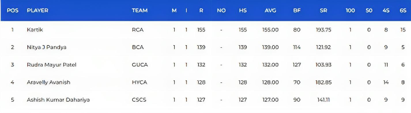 Meanwhile, Nitya J Pandya is in the second position. The swashbuckling Baroda opener has scored 139 runs so far from one game as well.