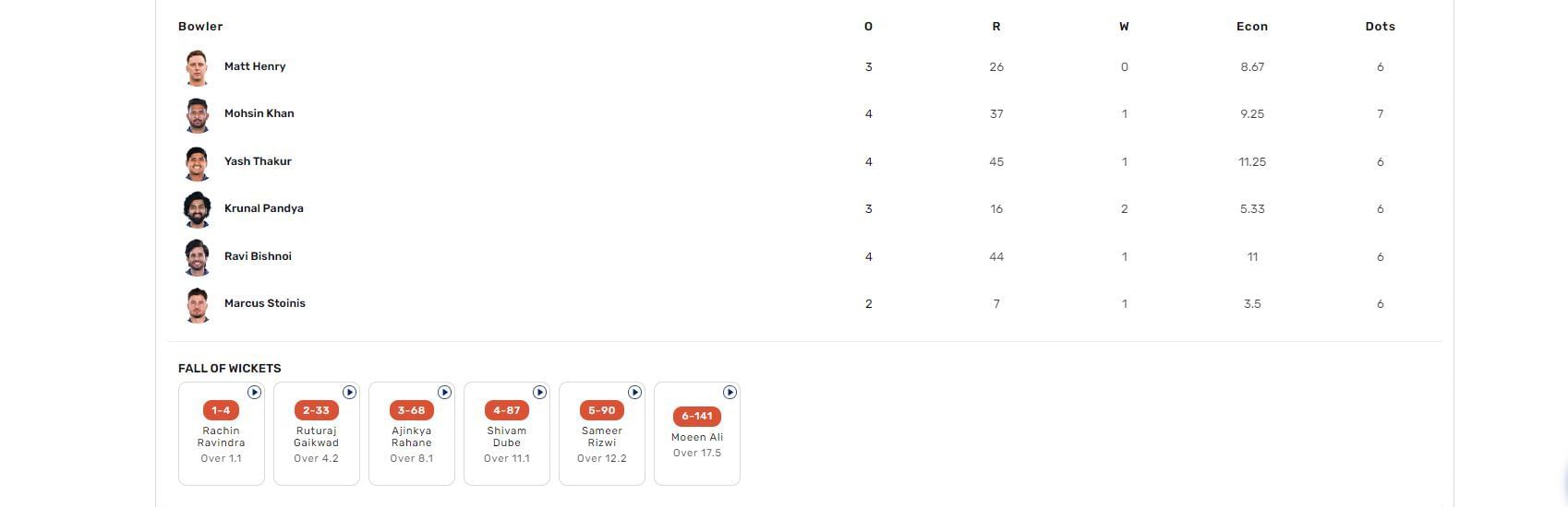 Krunal Pandya starred with the ball for Lucknow by returning with exceptional figures of 2/16 in his three overs. Mohsin Khan, Yash Thakur, Marcus Stoinis, and Ravi Bishnoi bagged one wicket each.