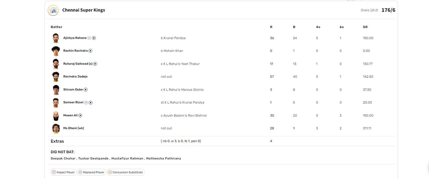 Asked to bat first, defending champions CSK posted 176/6 in their allotted 20 overs. The Super Kings got off to a poor start as Mohsin Khan cleaned up Rachin Ravindra for a golden duck. Skipper Ruturaj Gaikwad also departed for just 17 runs off 13 balls, caught behind by KL Rahul off Yash Thakur.