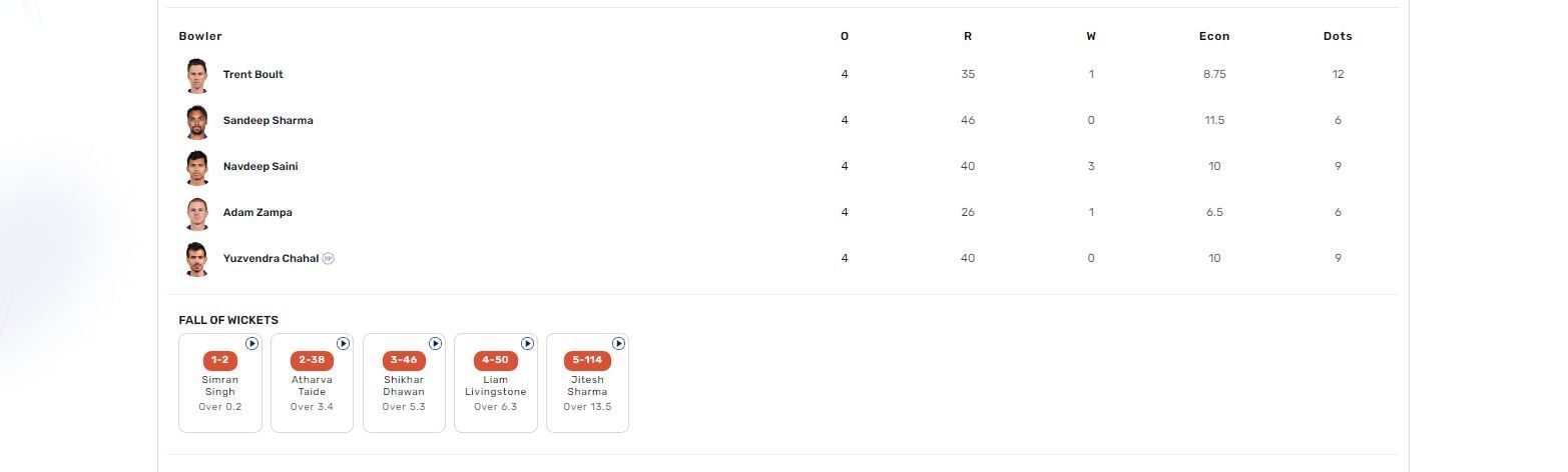 Kagiso Rabada emerged as the pick of PBKS bowlers, returning with figures of 2/40, while the other four bowlers bagged one wicket apiece.