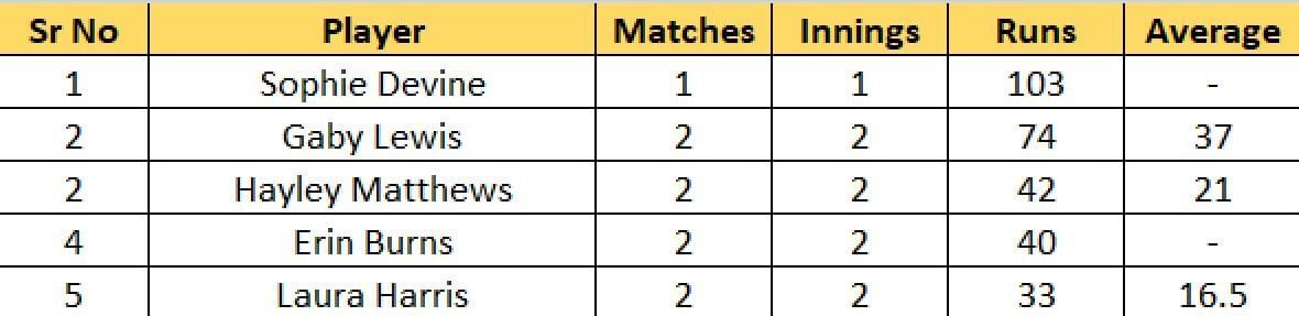 Gaby Lewis of Barbados Royals Women has jumped to the second spot in the most runs list after the conclusion of Match 2. The Irish batter played a well-composed knock in their win over Trinbago Knight Riders Women. She scored a run-a-ball 27 and has taken her tally to 74 in two games. She sits below Devine in the most runs charts.