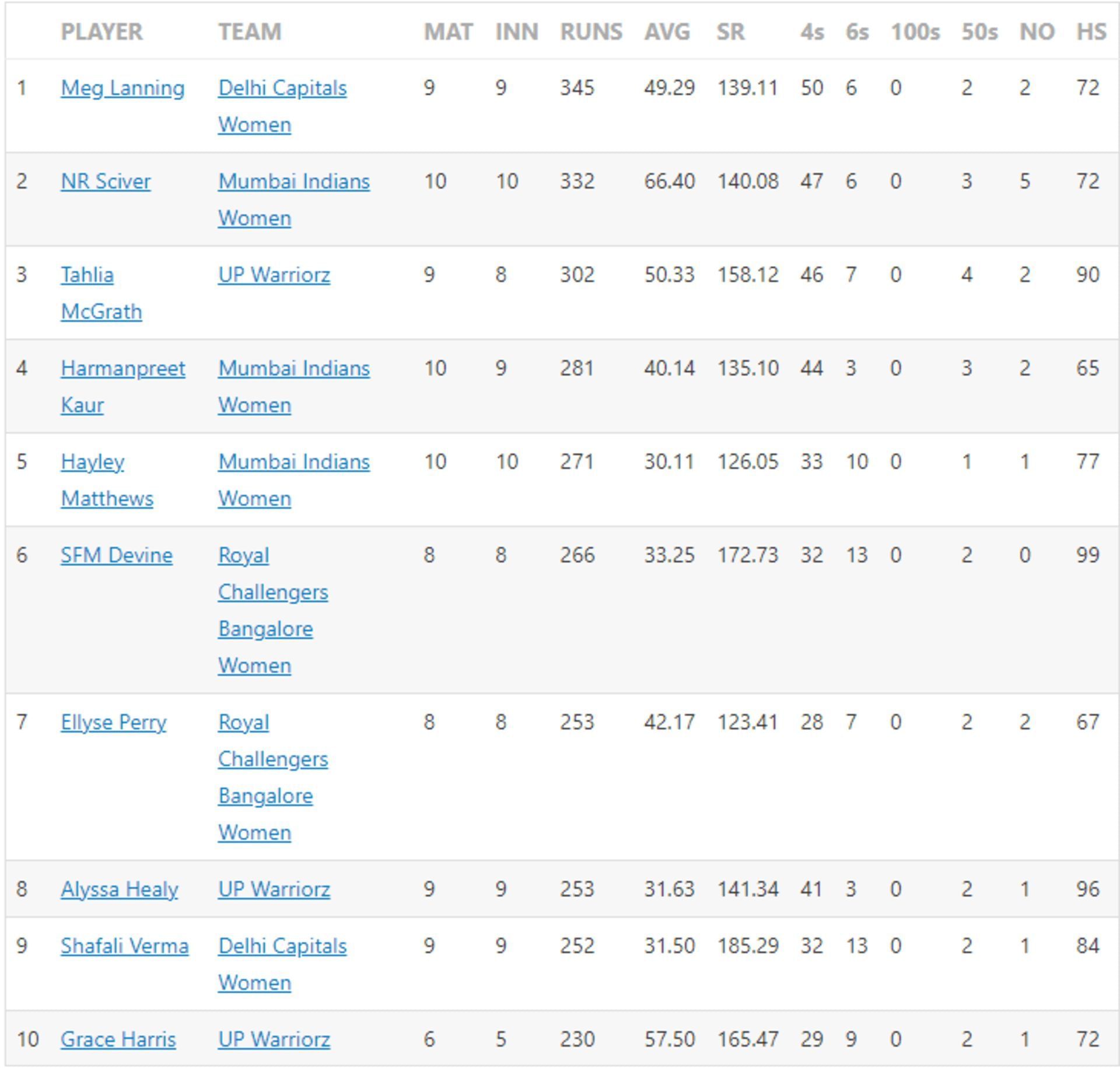 Meg Lanning ended up as the winner of the WPL 2023 Orange Cap after a magnificent campaign. The DC skipper top-scored for her side with 35 runs in the first innings and ended up with 345 across the campaign. She ended the season with an average of 49.29 and a strike rate of 139.11 following nine matches.