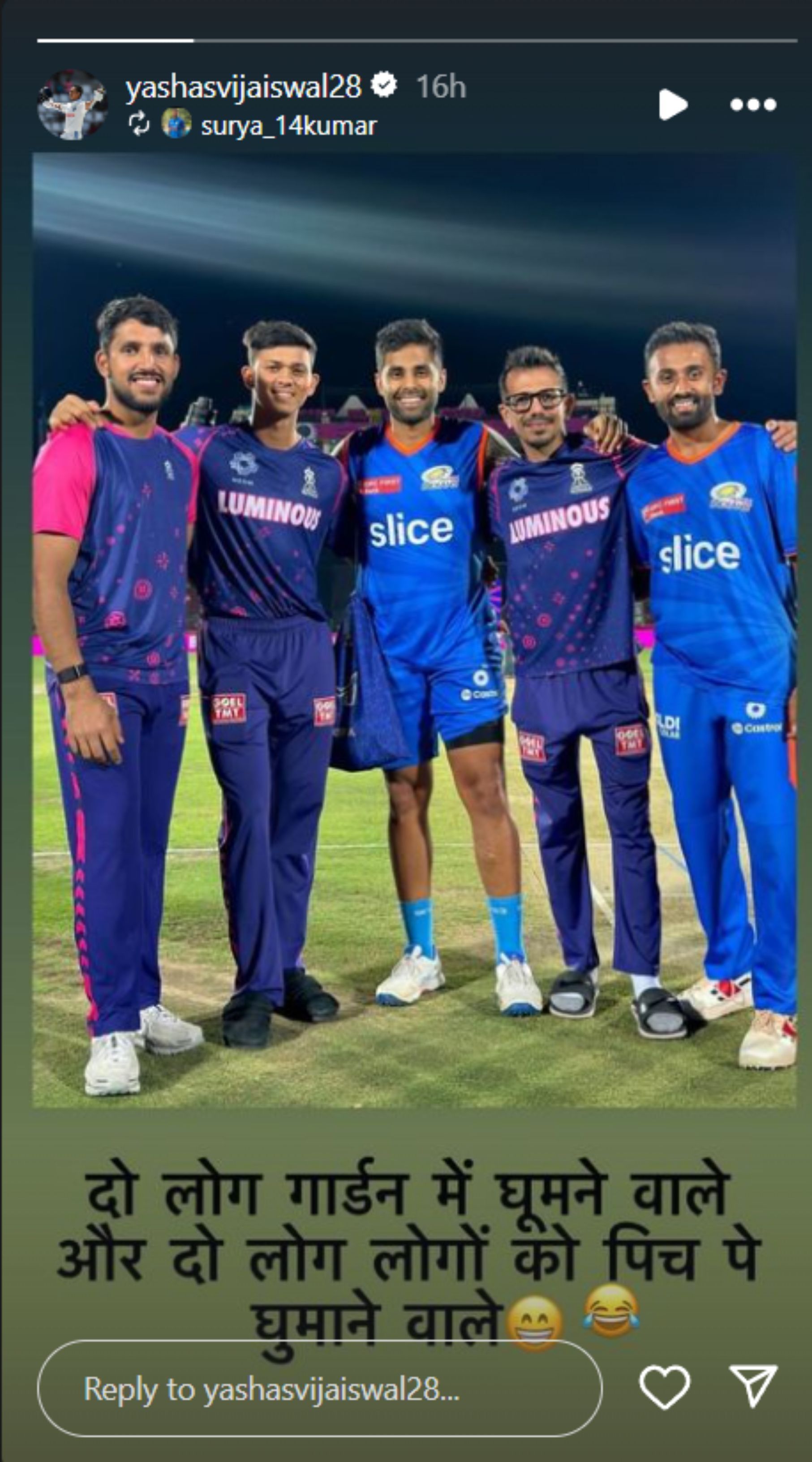 On the eve of the match, Jaiswal shared a picture on the story of his official Instagram handle with an interesting caption. In it, he could be seen along with Suryakumar Yadav, Dhruv Jurel, Yuzvendra Chahal, and Shreyas Gopal. He captioned: