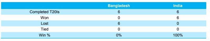 The head to head record between the two sides is completely one-sided, with India having defeated Bangladesh in all the six matches they have played in the past.