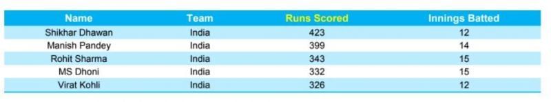 As we can see, the list of most runs scored amongst the two sides features only Indians in the top five. Manish Pandey, who has been extremely consistent, is closing in on Shikhar Dhawan at the top.