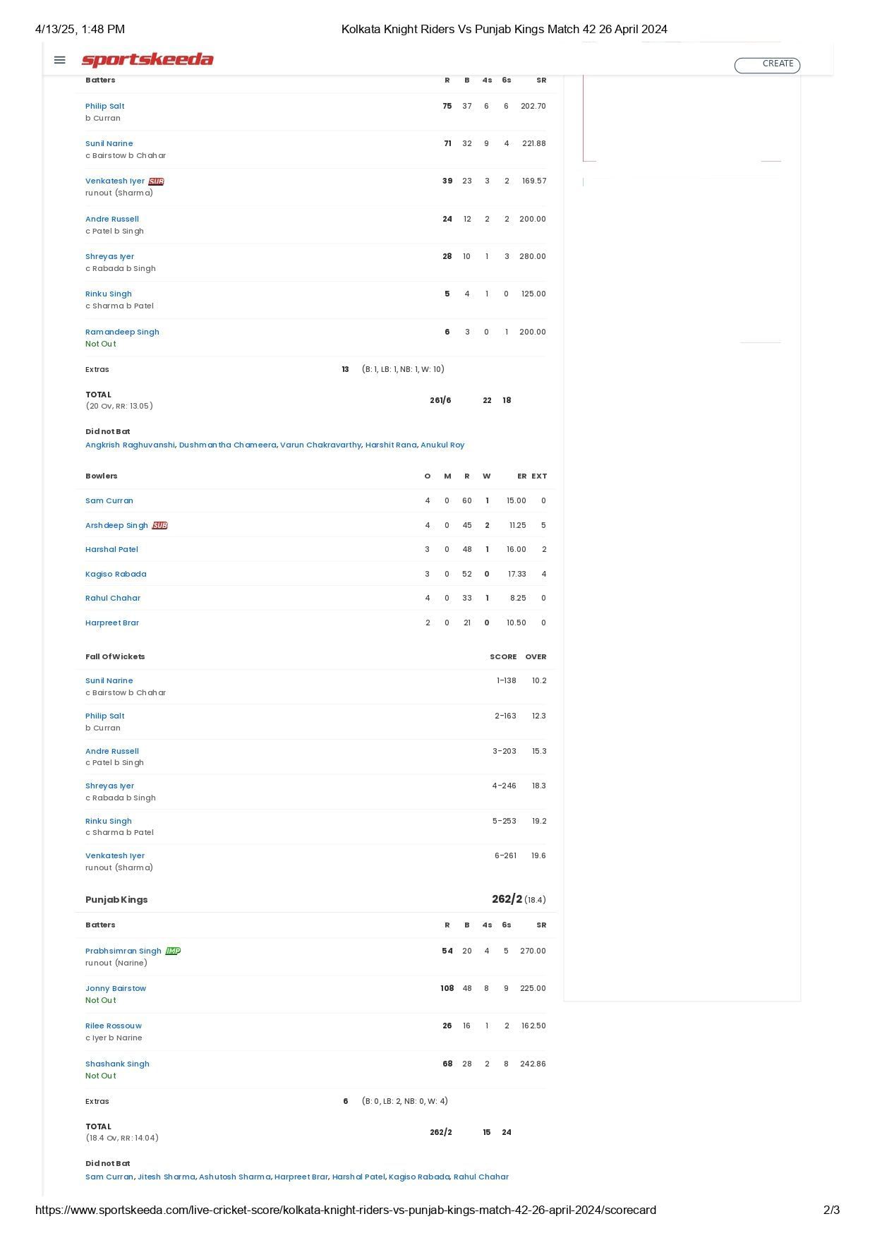 Invited to bat first, Kolkata put up a mammoth 261/6 in 20 overs. Phil Salt smashed 75 runs off 37 balls with the help of six maximums and as many boundaries. His opening partner Sunil Narine was equally brilliant, smashing 71 off 32 deliveries, with four sixes and nine boundaries. The duo put on a 138-run partnership for the opening stand. Meanwhile, Venkatesh Iyer, Andre Russell, and Shreyas Iyer also chipped in with 39 (23), 24 (12), and 28 (10), respectively.
