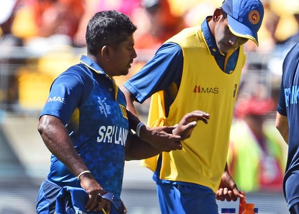 Herath bowling the 49th over of the England innings when he attempted to take a return catch on his fifth delivery off Jos Buttler. The ball hit his finger, leaving Herath on the ground in pain holding his hand.