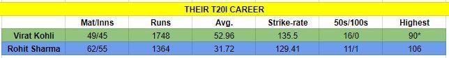 Yet again, Rohit had a better start to his career in a format when compared to Kohli. The latter had a relatively slow start to his career and was often termed as a player who can't give his best in the T20 format. He was scoring runs consistently and overtook Rohit after his first few matches, but he was not considered a T20 material while Rohit was establishing himself as India's best T20I batsman, thanks to his consistency.