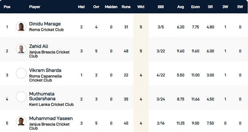 Dinidu Marage of Roma Cricket Club and Zahid Ali of Janjua Brescia Cricket Club, with 5 wickets each, have emerged as the highest wicket-takers after Day 2 of the Rome T10 League 2020. Marage is placed at the top of the list due to his superior strike rate of 4.80, with his wickets coming in one match fewer than Ali.